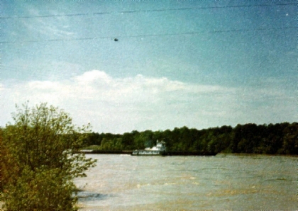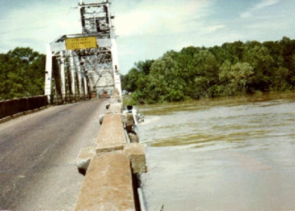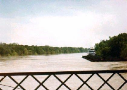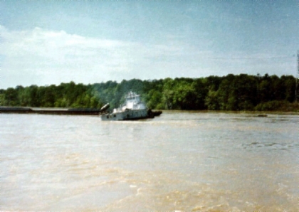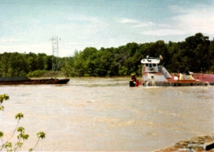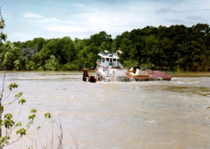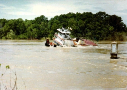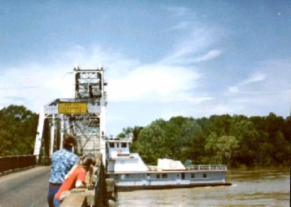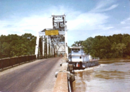 The photos below date from the spring flood of 1979. The tug released its barges on the lower side, but then ran into trouble and did turn over as the pictures show. This drawbridge has since been replaced by a clear span. Fortunately, no one was injured in this incident and the tug is still in operation on the Tombigbee.